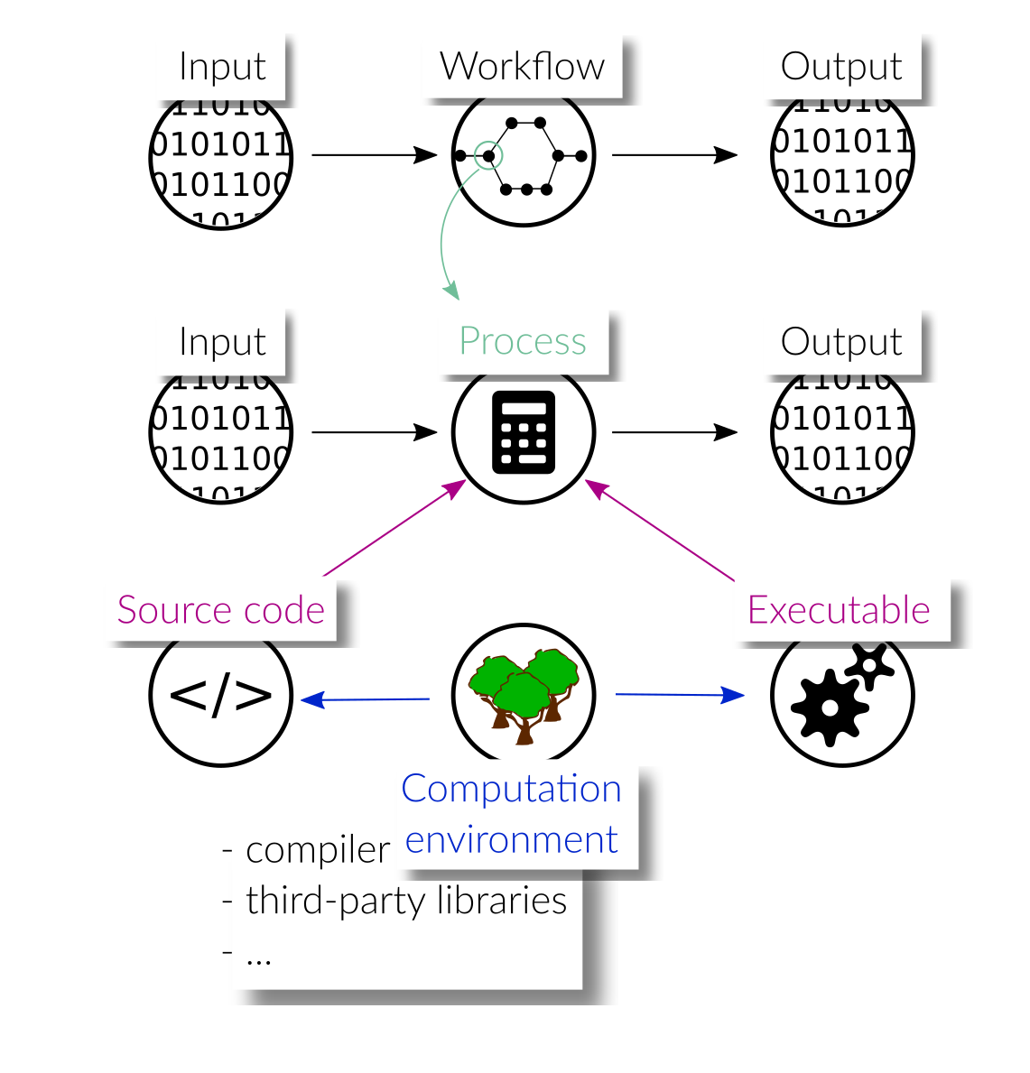 Each processing step, just as the workflow itself, typically processes some input and produces output data. Apart from changing the input data to operate on, processing steps can usually be configured by a set of parameters to change their behavior. Moreover, the behavior of a processing step is determined by its source code and/or executable binaries/packages that are called within it. Beyond this, the computation environment not only has a significant influence on its behavior, but is also crucial in order for the processing step to work at all. The environment includes the versions of the interpreters or compilers, as well as all third-party libraries and packages that contribute to the computations carried out in a processing step.