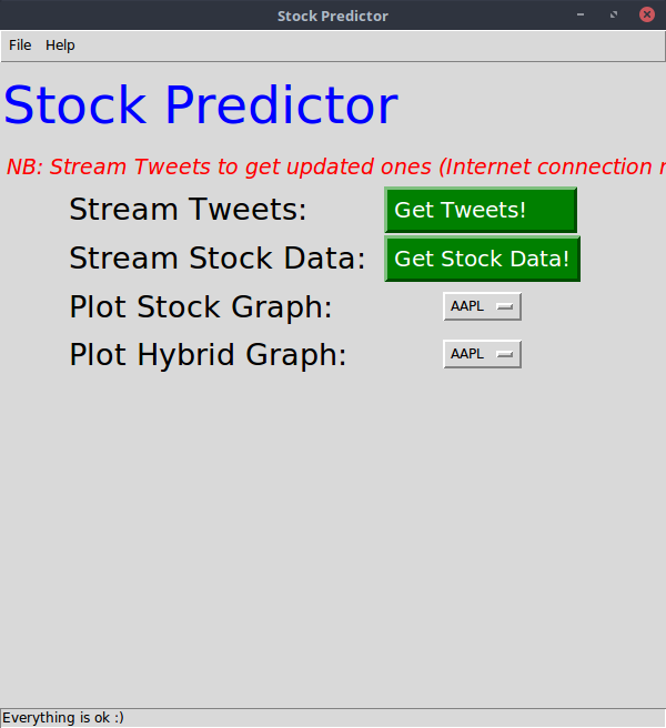 Press the Stream Tweets button to straem current tweets and the Stream Stock Data button to stream current stock data