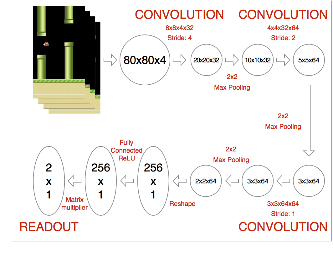 The architecture of the network is shown in the figure below. The first layer convolves the input image with an 8x8x4x32 kernel at a stride size of 4. The output is then put through a 2x2 max pooling layer. The second layer convolves with a 4x4x32x64 kernel at a stride of 2. We then max pool again. The third layer convolves with a 3x3x64x64 kernel at a stride of 1. We then max pool one more time. The last hidden layer consists of 256 fully connected ReLU nodes.
