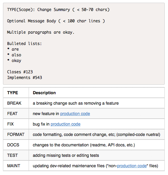 Every subject line starts with a TYPE – an all-caps indicator of the general category of this commit. Types include FEAT, FIX and DOCS (See Types below for full list).