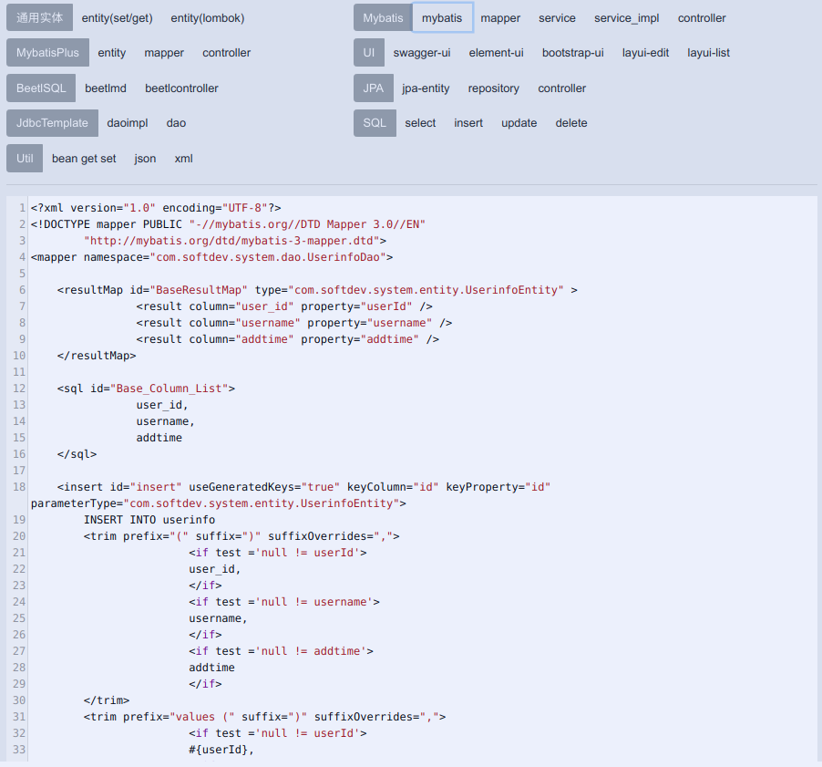 • √ 用DDL-SQL语句生成JPA/JdbcTemplate/Mybatis/MybatisPlus/BeetlSQL相关代码.