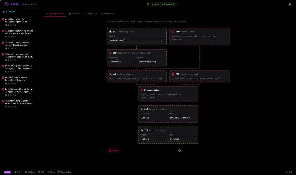 audia is an agentic Python package that converts PDFs — academic papers, reports, regulations — into podcast-style audio files. It uses an LLM to rewrite content into natural spoken language (math in plain English, tables as sentences, no citations) before passing it to a TTS engine, so the result actually sounds good when read aloud.