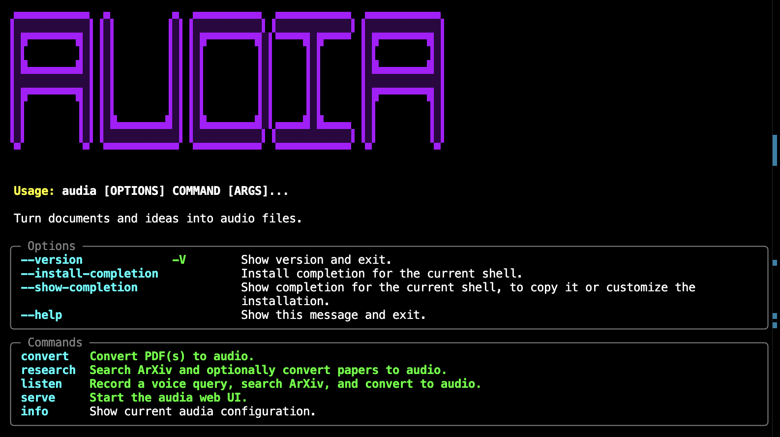 audia convert,research,listen,serve,info - Web UI — FastAPI backend + SPA frontend