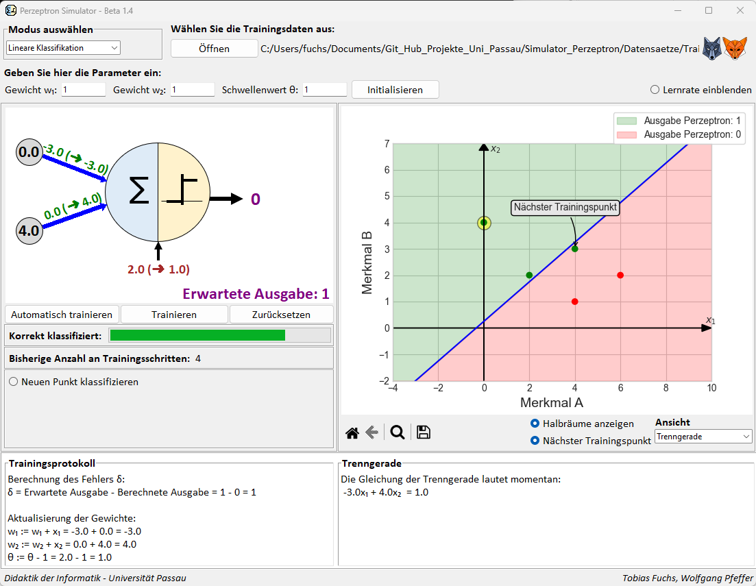 Die Software bietet die Möglichkeit den Lernprozess eines Perzeptrons für zwei verschiedene Anwendungskontexte, die Lineare Klassifikation und die Lineare Regression zu simulieren. Neben einer schematischen Darstellung des Perzeptrons mit den jeweils aktuellen Parametern wird ein weiterer Fokus auf die graphische Darstellung der geometrischen Interpretation des Perzeptrons gelegt. Daneben werden auch noch weitere Ansichten, wie etwa zur geometrischen Visualisierung der Gewichtsanpassungen, zur Verfügung gestellt.