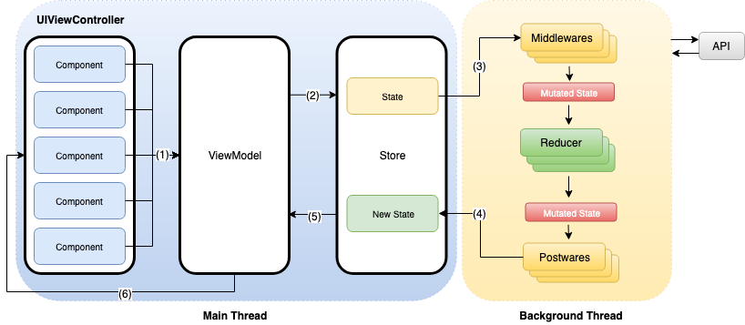 - (2) : ViewModel passes the actions to the store. You can use beforeDispatch(action:) method to do some work before dispatching actions.