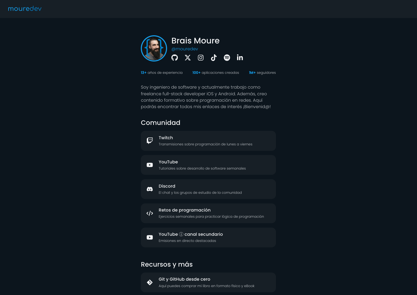 Soy ingeniero de software desde 2010. Desde 2018 combino mi trabajo desarrollando Apps con la creación de contenido formativo sobre programación y tecnología en diferentes redes sociales como @mouredev.