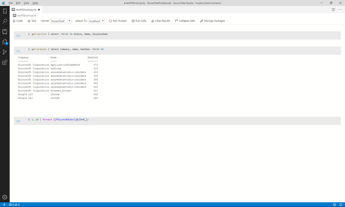Notice the second cell has the results of running get-process | select company, name, handles -first 10