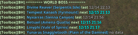 | wb | Display respawn times of World Bosses. | Отобразить время появления мировых боссов. |