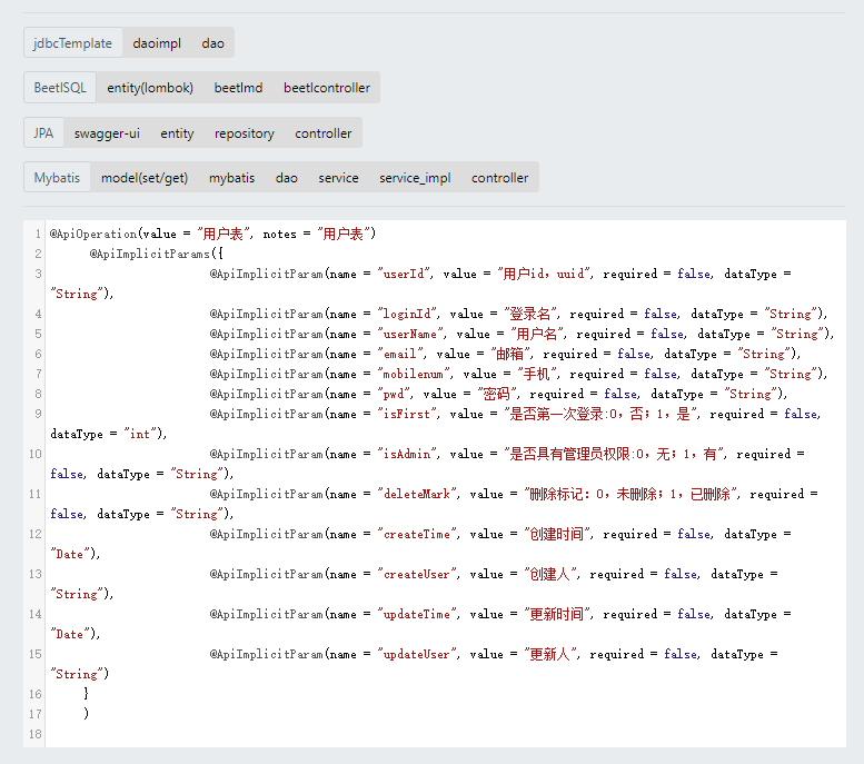 基于SpringBoot2+Freemarker的代码生成器,用DDL SQL语句生成JPA/JdbcTemplate/Mybatis/BeetlSQL相关代码,支持mysql/oracle/pgsql三大数据库。以释放双手为目的,各大模板也在陆续补充和优化。欢迎大家提交模板和交流想法!