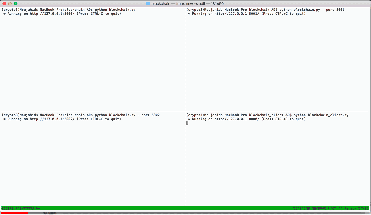 blockchainfolder and execute the command below:python blockchain.py -p 5000 - You can add a new node to blockchain by executing the same command and specifying a port that is not already used. For example,