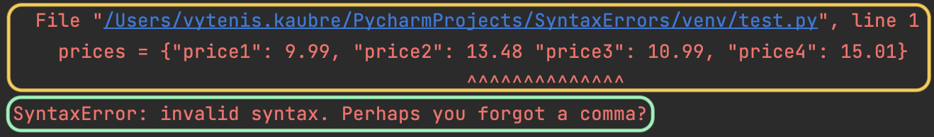prices = {"price1": 9.99, "price2": 13.48, "price3": 10.99, "price4": 15.01}Now, rerun the code to see what’s the second syntax error: