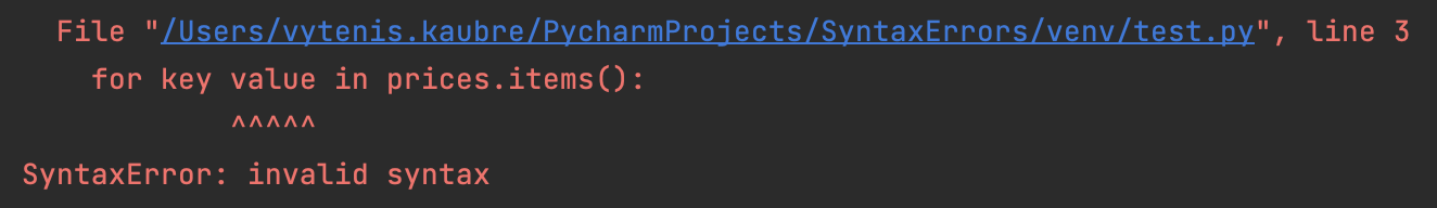 for url in product_urls:- Make sure you’re not using the reserved Python keywords to name variables and functions. If you’re unsure whether a word is or isn’t a Python keyword, check it with the keyword module in Python or look it up in the reserved keywords list. Many IDEs, like PyCharm and VS Code, highlight the reserved keywords, which is extremely helpful. The code snippet below uses the reserved keyword `pass` to hold the password value, which causes the syntax error message: