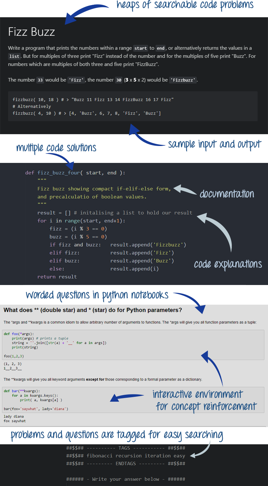 More python code examples and exercises than you could ever need, all documented and explained for effective and fast learning. Comes with a GUI Exercise Search and Launcher out of the box.