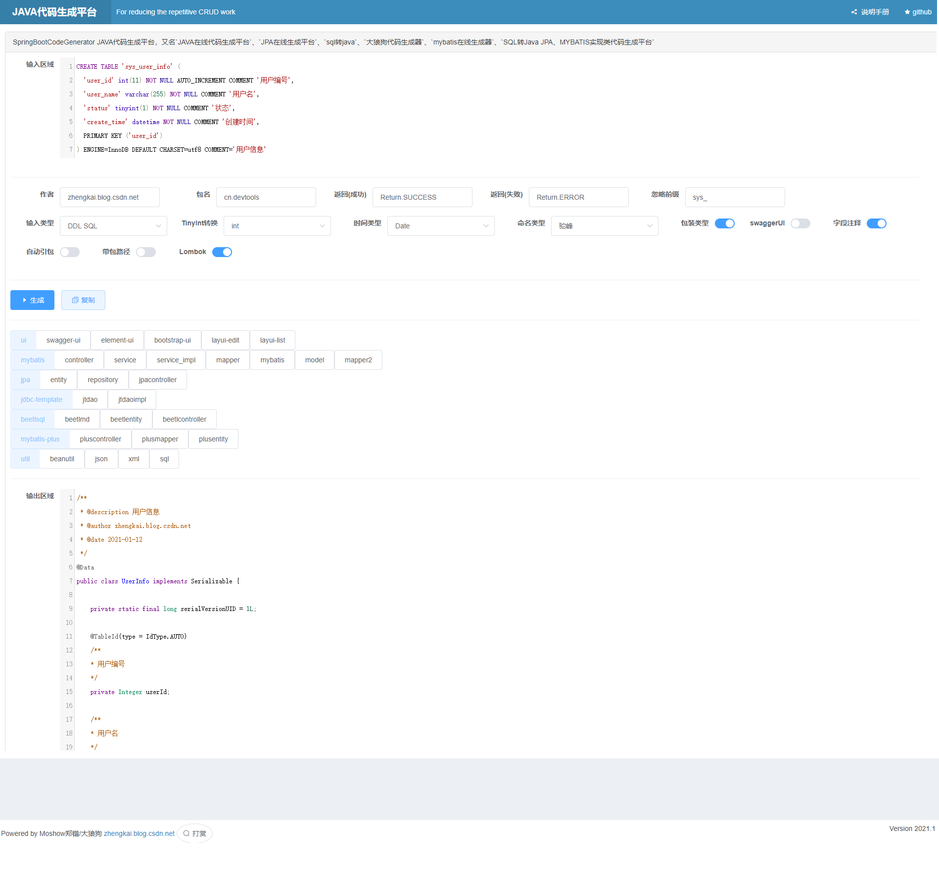 又名JAVA在线代码生成平台sql转java大狼狗代码生成器mybatis在线生成器SQL转Java JPA、MYBATIS实现类代码生成平台