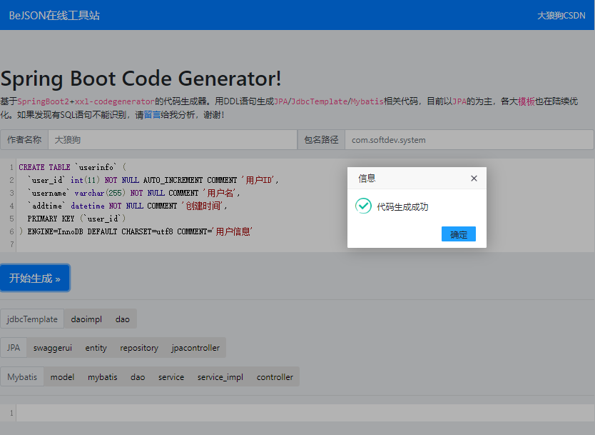 基于SpringBoot2+Freemarker的代码生成器。用DDL语句生成JPA/JdbcTemplate/Mybatis相关代码,目前以JPA的为主,各大模板也在陆续优化。