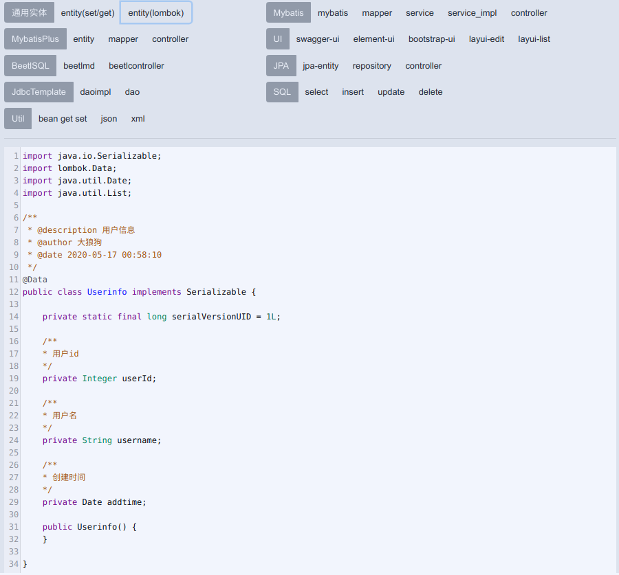 √基于SpringBoot2+Freemarker的代码生成器,√以释放双手为目的,√支持mysql/oracle/pgsql三大数据库, √用DDL-SQL语句生成JPA/JdbcTemplate/Mybatis/MybatisPlus/BeetlSQL相关代码.