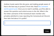 andrew seems to be doing *better*. they're showing up in public again at the very least. a coworker of mine went and got drinks with them while in town, and got a special huss-guided trip to the problem sleuth racial diversity mural. and then spent a whole meeting bragging about it. there's some new stuff in the works, hiveswap is still chugging despite it all, and the homestuck sequel is finally sloughing off the baggage of its old writing team and is turning out quite good, it's good times for homestuck at the moment.