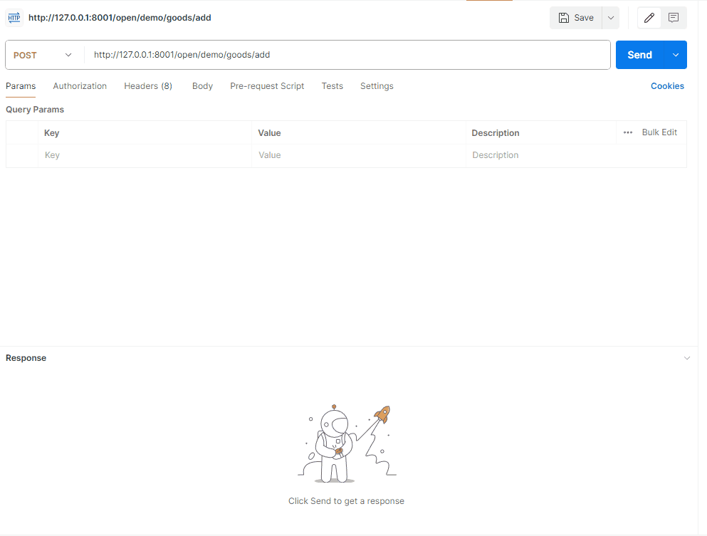POST /open/demo/goods/add新增POST /open/demo/goods/delete删除POST /open/demo/goods/update更新GET /open/demo/goods/info单个信息POST /open/demo/goods/list列表信息POST /open/demo/goods/page分页查询(包含模糊查询、字段全匹配等)