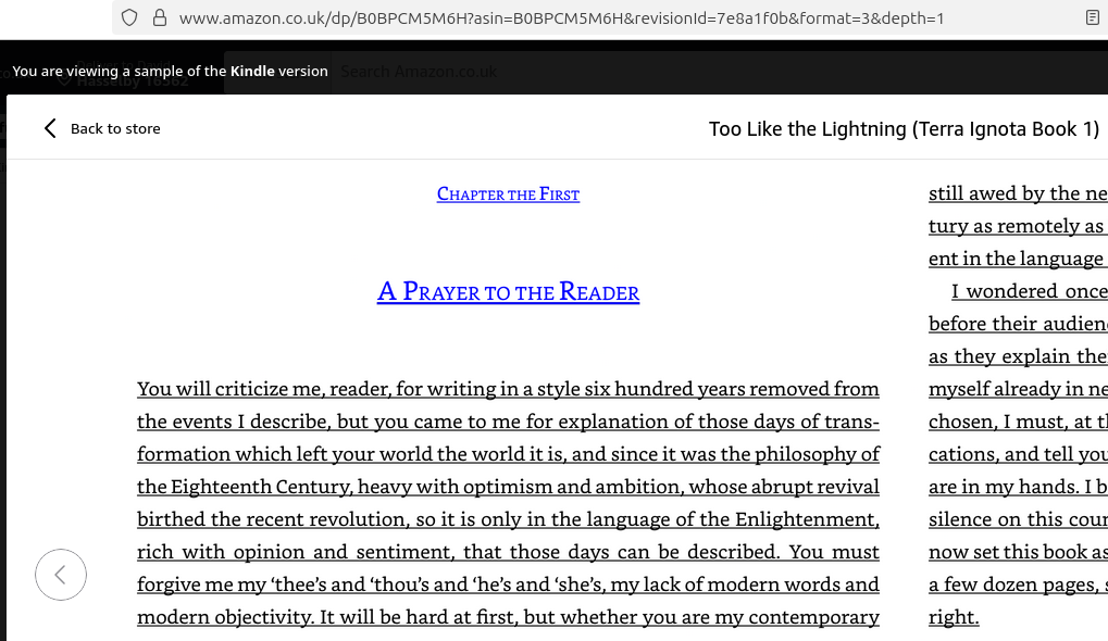 I saw a book recommendation on Hacker News a while back for “Too Like the Lightning” by Ada Palmer. One of the great (and expensive) things about the modern world is that buying a book is a few clicks away, so I bought a copy for my Kindle.