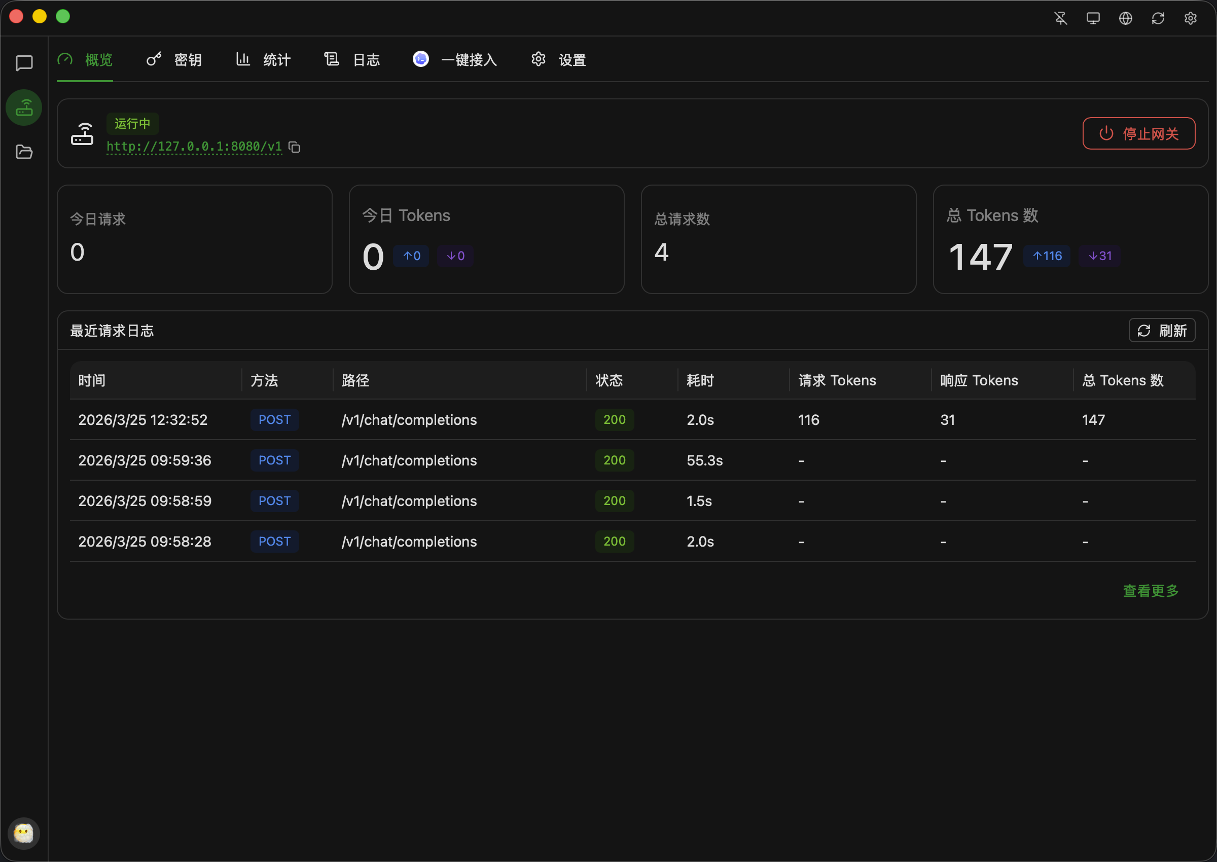 • 本地 API 网关 — 内置 OpenAI 兼容、Claude、Gemini等原生接口的本地 API 服务器,可作为任意兼容客户端的后端