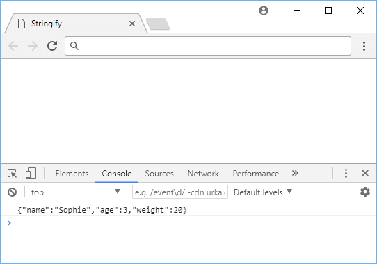 Stringify took the dog JavaScript object and converted it into a string. That string is now valid JSON and can be saved to a file or transferred over the network.