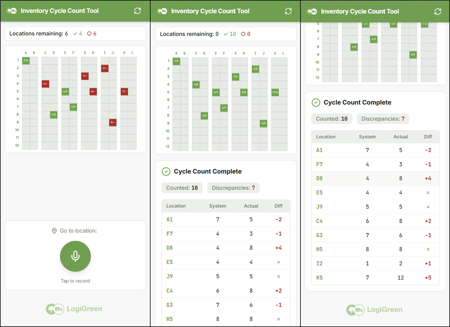The app guides the operators across the warehouse to check the right locations and records the information (Example: "Location K5, 12 units) using the voice recognition connected to the audio input.