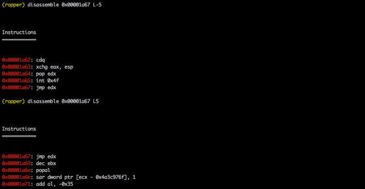 jmp_regs = rs.searchJmpReg(name=ls, regs=['esp', 'eax']) # looks for jmp reg only in 'test-binaries/ls-x86'