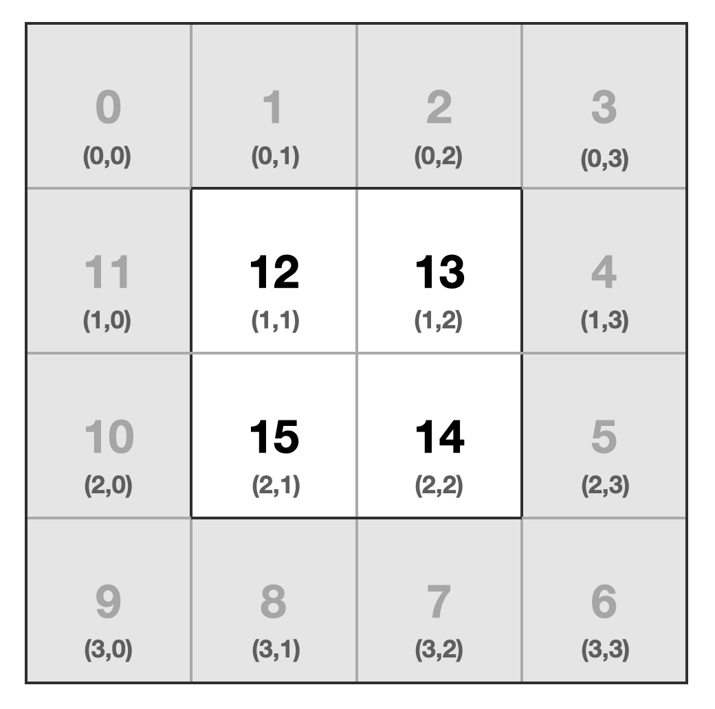 Now if we want to continue our traversal, we see that our problem looks identical to how we started. We need to walk the "new" perimeter and move the final index of each side inward by one.