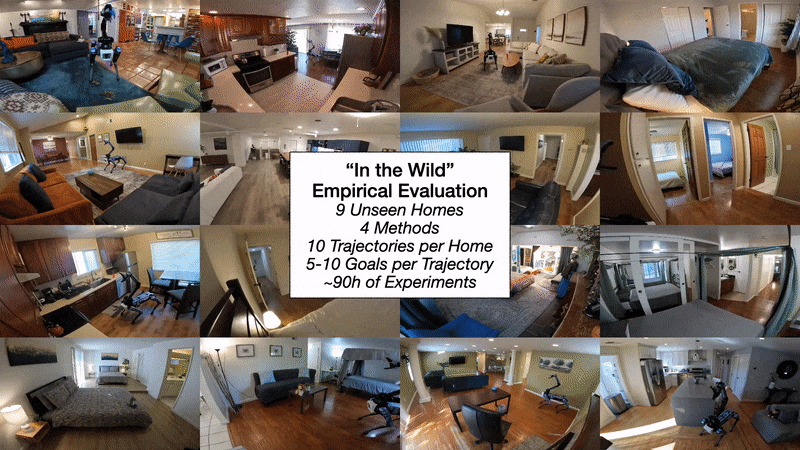 We evaluate goat “in the wild” in 9 unseen rented homes without pre-computed maps or locations of objects. We evaluate 4 methods - GOAT and 3 baselines - for 10 trajectories per home with 5-10 goals per trajectory, for a total of 90 hours of experiments.