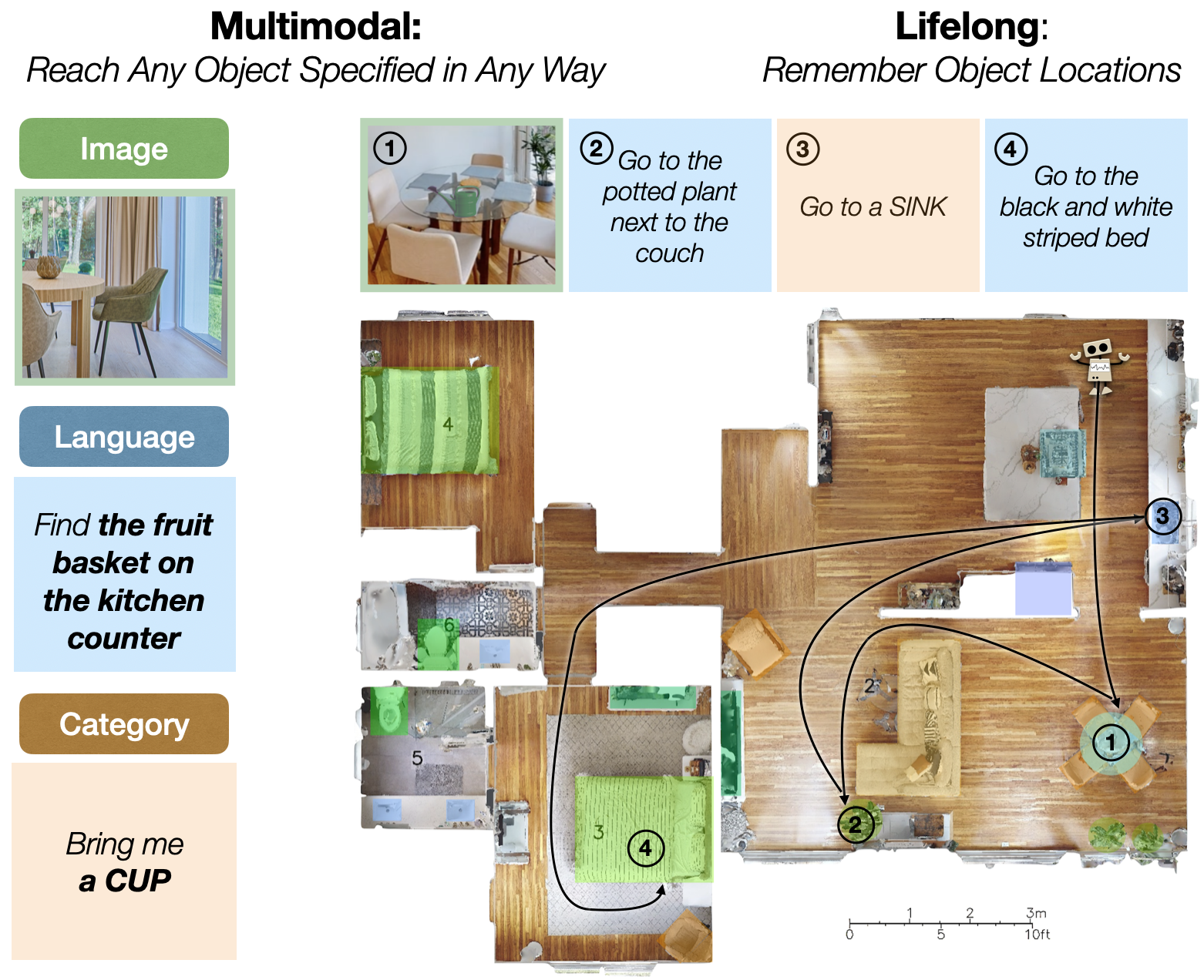 Imagine dropping a robot in an unknown home and asking it pick up a cup from the coffee table and bring it to the sink. What makes this challenging? The robot needs to explore the environment, detect and localize relevant objects, remember their locations, and navigate to, pick, and place objects. In any realistic deployment setting, a general navigation primitive should be multitask and lifelong.