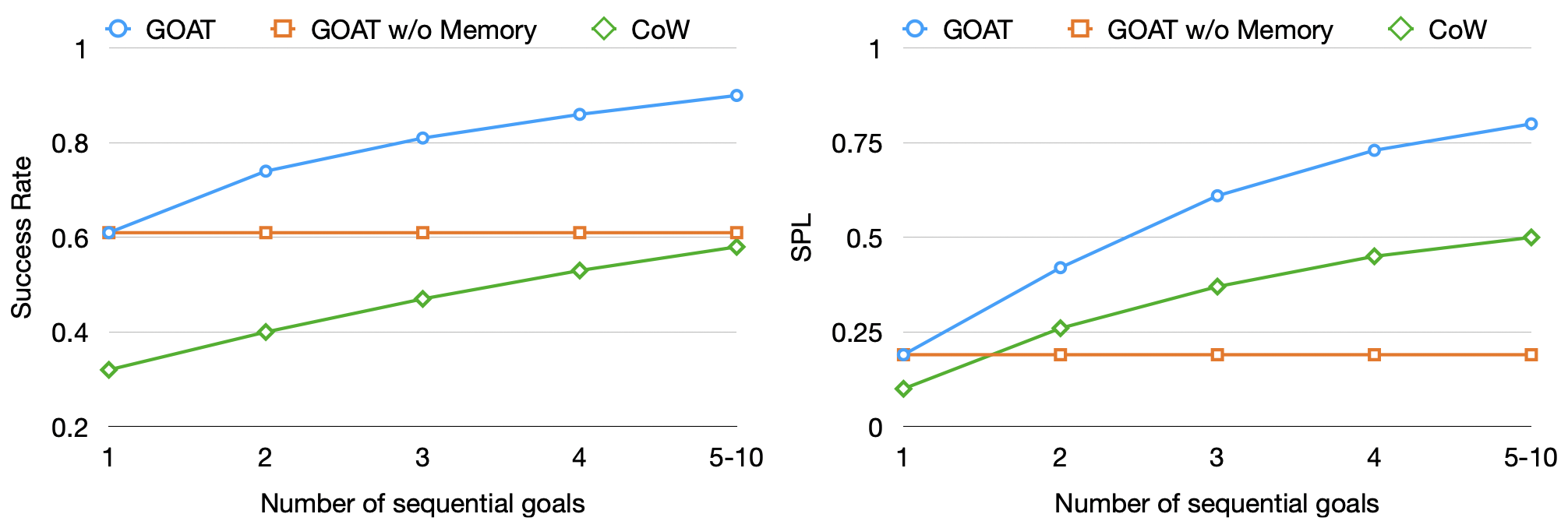 GOAT performance improves with experience in the environment: going from a 60% success rate (and 0.20 SPL) at the first goal to a 90% success rate (and 0.80 SPL) for goals 5-10 after thorough exploration. Conversely, GOAT without memory shows no improvement from experience, while COW benefits but plateaus at much lower performance.