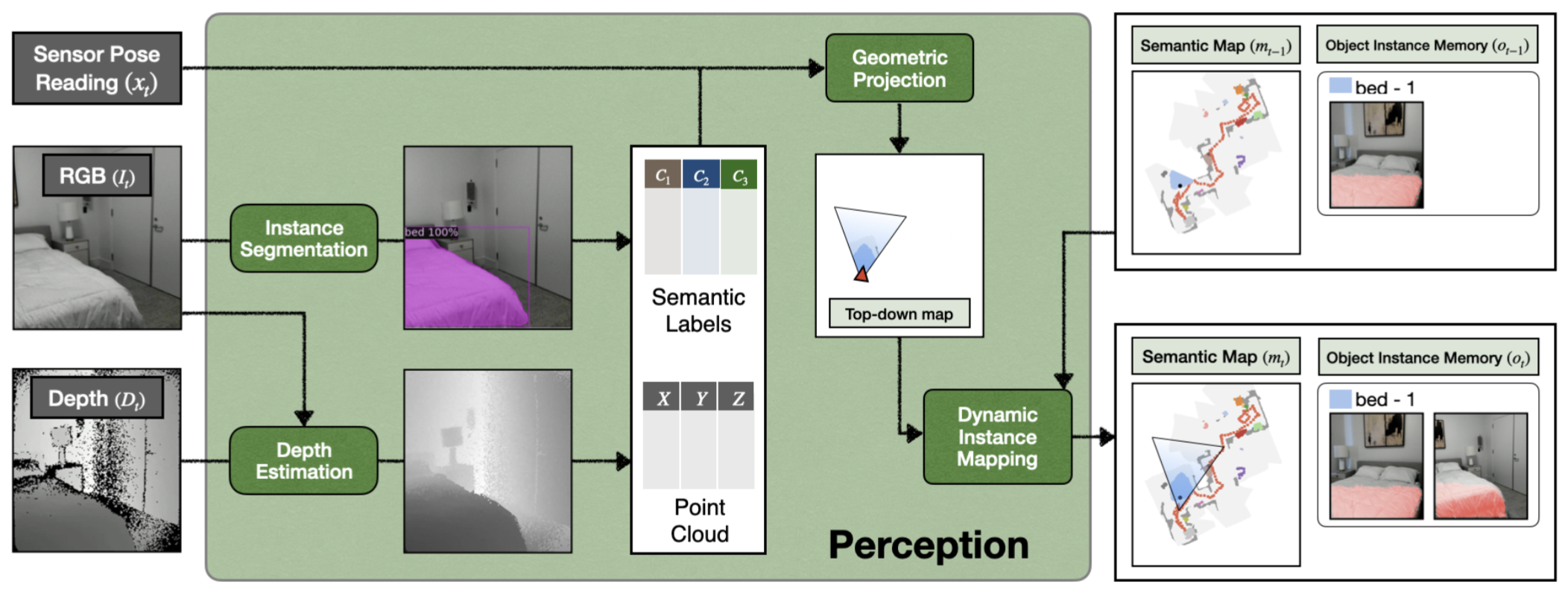 The perception system takes as input the current depth image, RGB image, and pose reading from onboard sensors. It uses off-the-shelf models to segment instances in the RGB image and estimate depth to fill in holes for reflective objects in raw sensor readings. Object detections are then projected and added to a top-down map of the scene. For each object detected, we also store the image in which the object was detected as part of the object instance memory.