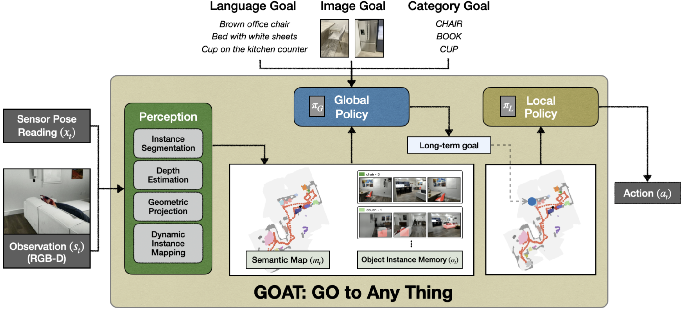 As the agent moves through the scene, the perception system processes RGB-D camera inputs to detect object instances and localize them into a top-down semantic map of the scene. In addition to the semantic map, GOAT maintains an Object Instance Memory that localizes individual instances of object categories in the map and stores images in which each instance has been viewed. This memory allows the agent to localize and navigate to any object instances that have been observed previously. A global policy takes this lifelong memory representation and a goal object specified as language, an image, or a category, and outputs a long-term goal in the map. Finally, a local policy plans a trajectory to achieve this long-term goal and outputs actions to be taken by the agent.