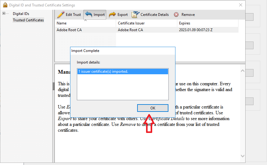 Please follow the steps exhibited in the following screen-shots in order to add the self-signed certificate into Adobe’s list of Trusted identities: