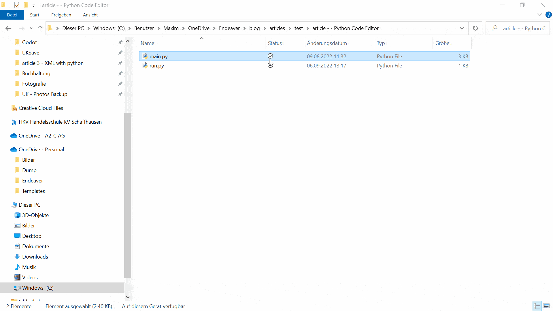 Now let us come to the function that actually runs the program. This will be called when the user presses control + r. In the function, we simply open a file called run.py that will temporarily store the code that we get with get(start, end), and then we run this file with start cmd /K "python run.py". We do it this way, so a new command prompt window is opened. We want that the program runs separately from the current one.