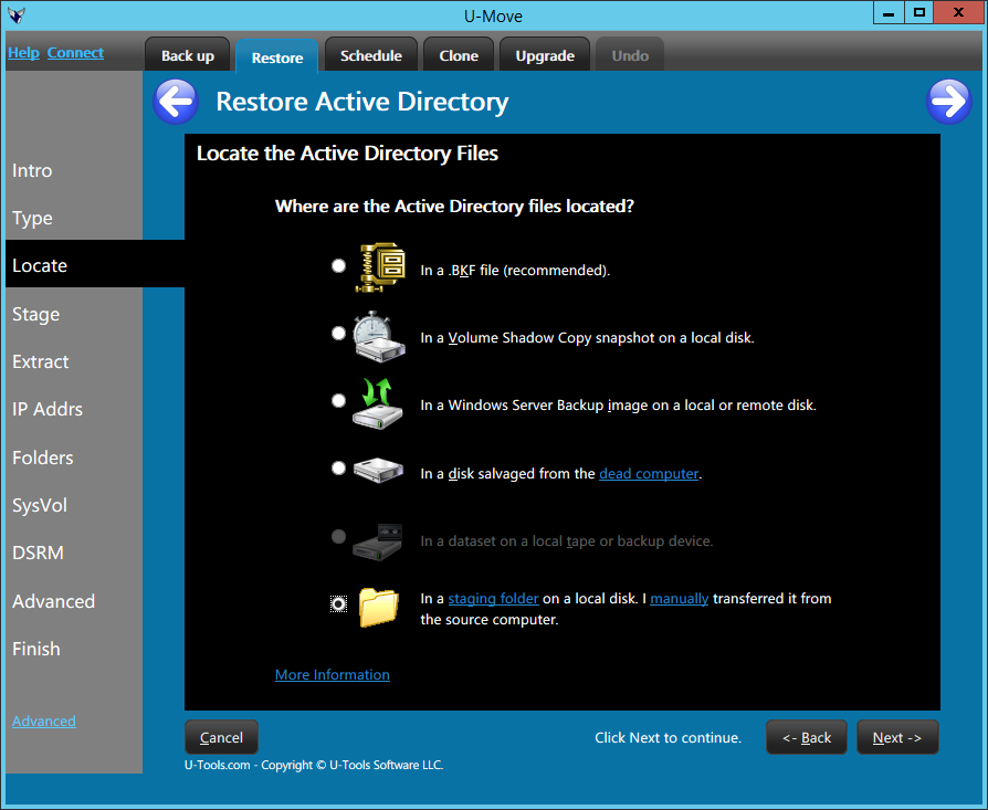 U-Move can restore Active Directory in emergency situations. For example, U-Move can read damaged or corrupt .BKF files. And U-Move can restore an old backup that has expired (made more than 60-180 days ago).