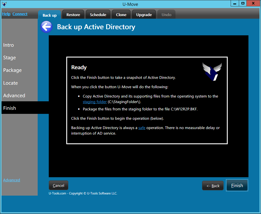 Creating a backup with U-Move is always safe. The backup operation will not modify the content of your Active Directory database in any way.
