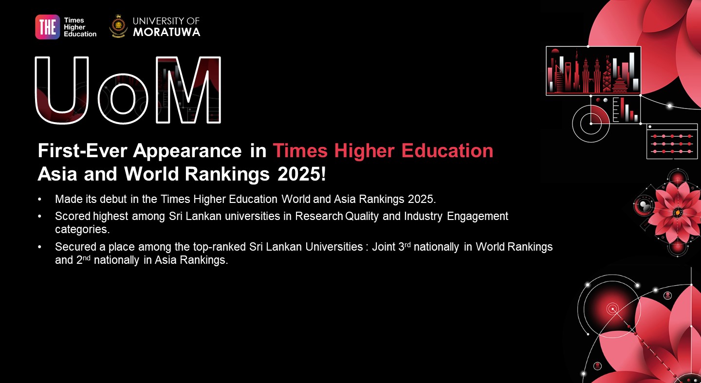 Emboldened by the daring vision of becoming South Asia’s center of excellence in technology and related disciplines, the University of Moratuwa prides itself in being a hub of innovation and creativity. Encouraging its students to think out of the box from day one, the curriculum of the university takes a futuristic approach. Backed by a faculty that is dedicated towards delivering excellence in education, with the right infrastructure in place to facilitate a seamless learning experience, and a research program that has made a significant contribution towards the global knowledge bank, the university is a fully equipped hub in delivering excellence to its students and to the society as a whole.