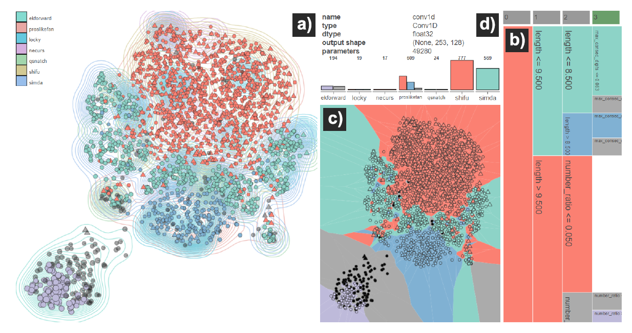 Abstract. Due to their success in many application areas, deep learning models have found wide adoption for many problems. However, their blackbox nature makes it hard to trust their decisions and to evaluate their line of reasoning. In the field of cybersecurity, this lack of trust and understanding poses a significant challenge for the utilization of deep learning models. Thus, we present a visual analytics system that provides designers of deep learning models for the classification of domain generation algorithms with understandable interpretations of their model. We cluster the activations of the model’s nodes and leverage decision trees to explain these clusters. In combination with a 2D projection, the user can explore how the model views the data at different layers. In a preliminary evaluation of our system, we show how it can be employed to better understand misclassifications, identify potential biases and reason about the role different layers in a model may play.
