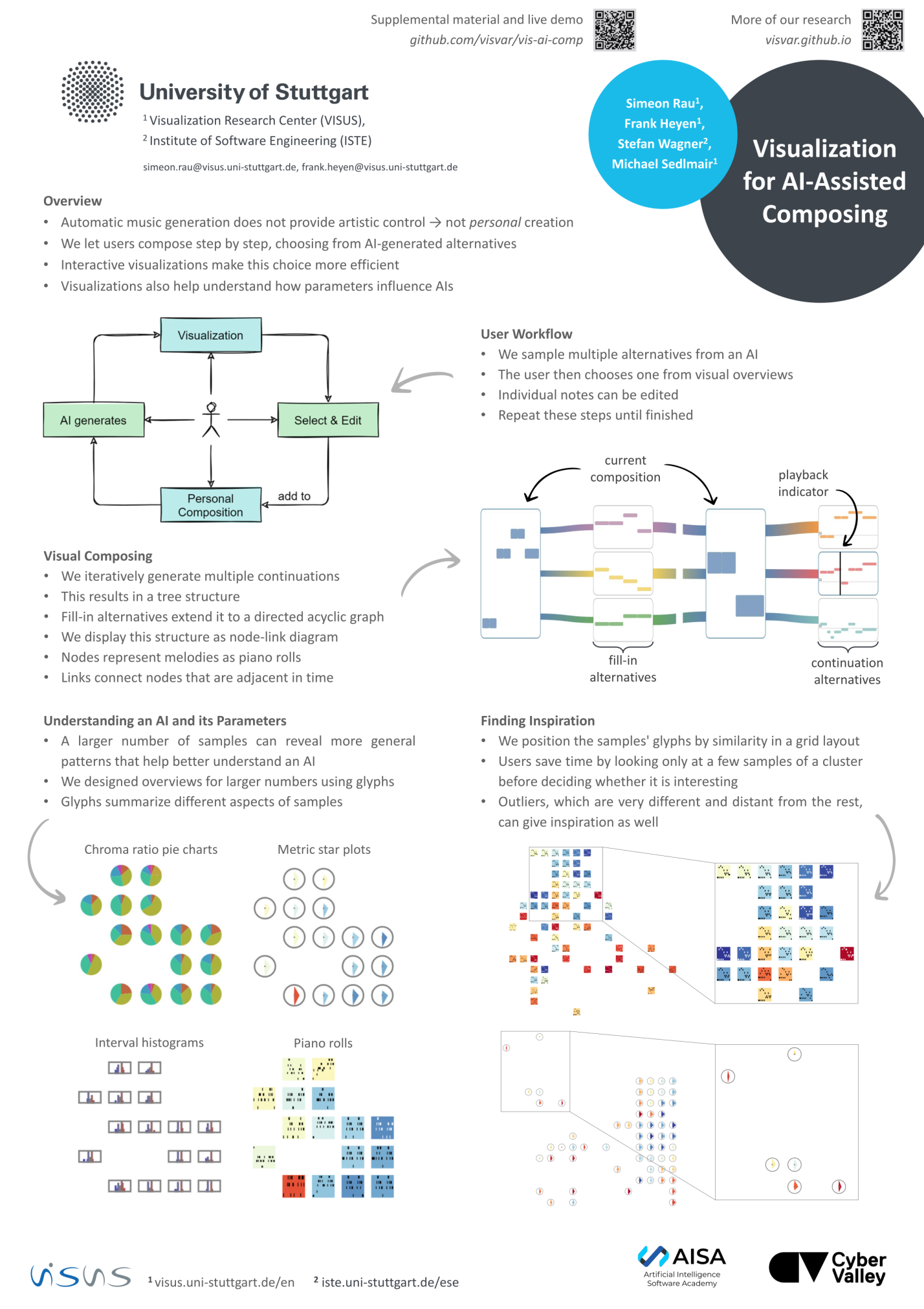 Abstract. We propose a visual approach for interactive, AI-assisted composition that serves as a compromise between fully automatic and fully manual composition. Instead of generating a whole piece, the AI takes on the role of an assistant that generates short melodies for the composer to choose from and adapt. In an iterative process, the composer queries the AI for continuations or alternative fill-ins, chooses a suggestion, and adds it to the piece. As listening to many suggestions would take time, we explore different ways to visualize them, to allow the composer to focus on the most interesting-looking melodies. We also present the results of a qualitative evaluation with five composers.