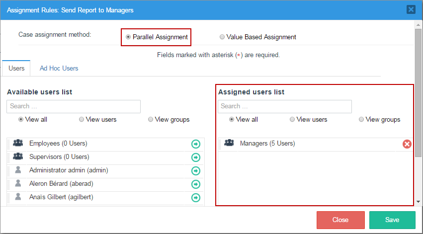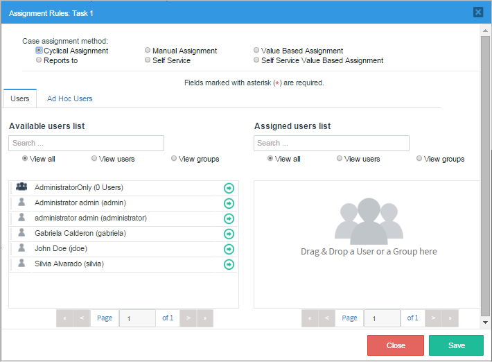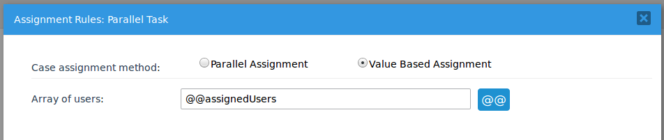For "Task 2", right click on it and select simply "Assignment Rules". In here the case assignment method is "Value Based Assignment" a new field named "Variable for Value Based Assignment" will appear where the variable "@@NextUser" must be added, click on the "Save" button to store all changes.