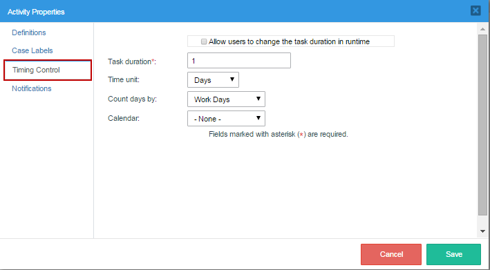 This property is used to set a task's due date. The task should be completed within a determined time period, which can be set according to a number of work days or days in a customized calendar.
