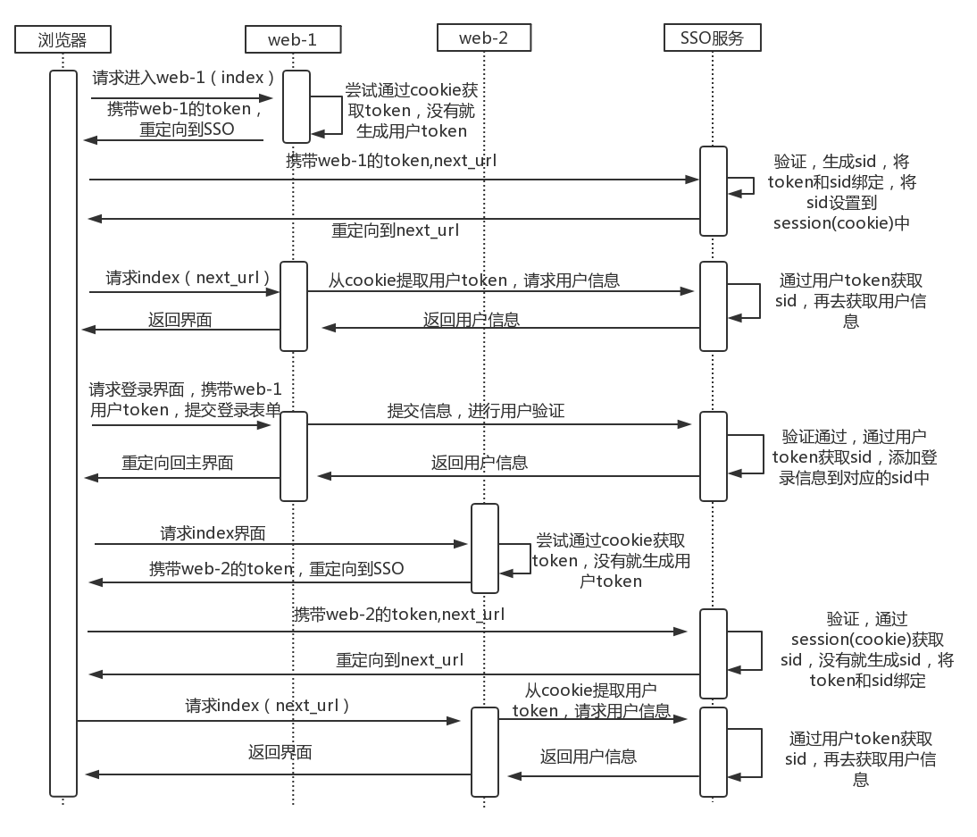 该方案通过跳转sso服务器地址来记录同一个用户的信息,通过设置一个用户sid(session),并将其绑定到子系统web-1生成的token,当用户通过该token进行请求时,就能对应上用户信息。