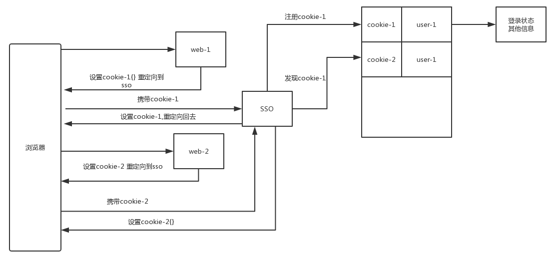 而web-2子系统,通过步骤1生成一个token-2,设置到cookie,并重定向到SSO中,现在SSO通过session或者cookie发现该用户已经通过其他子系统生成了sid,然后将该用户在web-2子系统生成的用户token-2与sid绑定到一起,这样web-2子系统也能通过用户token-2来获取同一个用户sid对应的信息了。