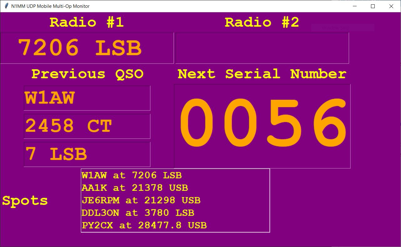 Provides a remote window to display some broadcast data from an N1MM+ Ham Radio Logger. This can be displayed on another machine, monitor, or even a phone/tablet if the fonts are adjusted.