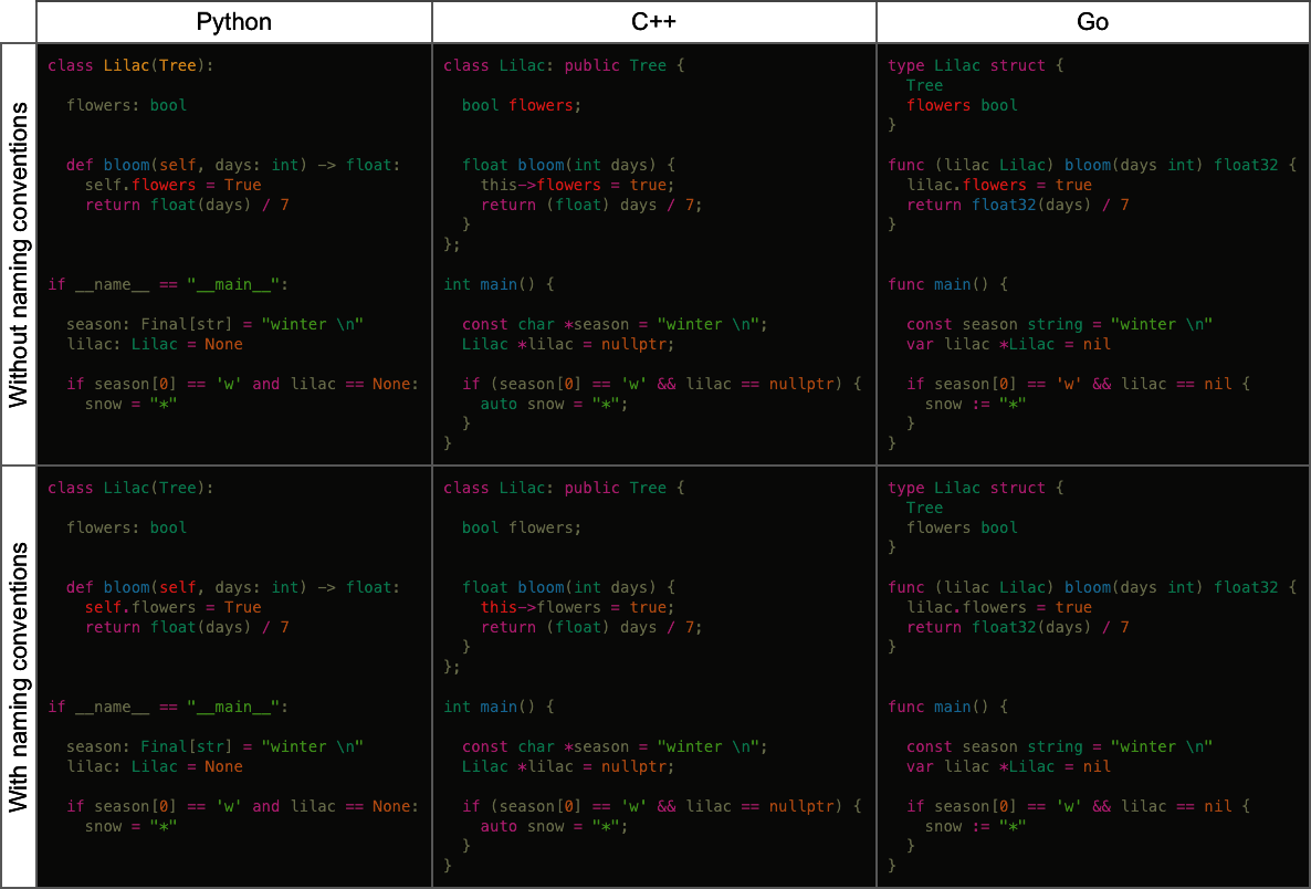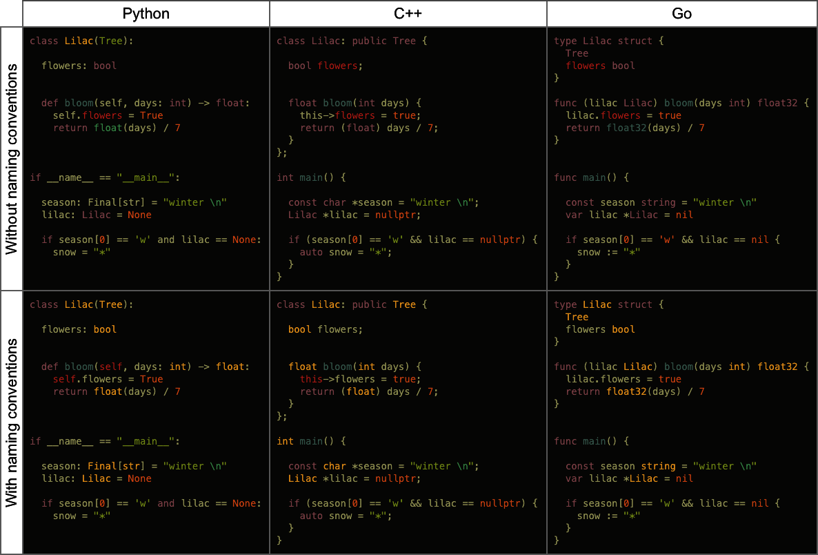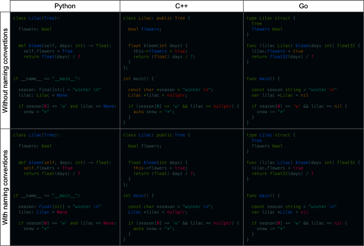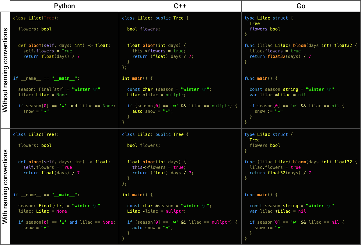Here are some previews of the improvements brought by this PR. For each theme, notice the differences before and after implementing the naming conventions. Syntax highlighting is really harmonized across languages. Python: class Lilac(Tree):