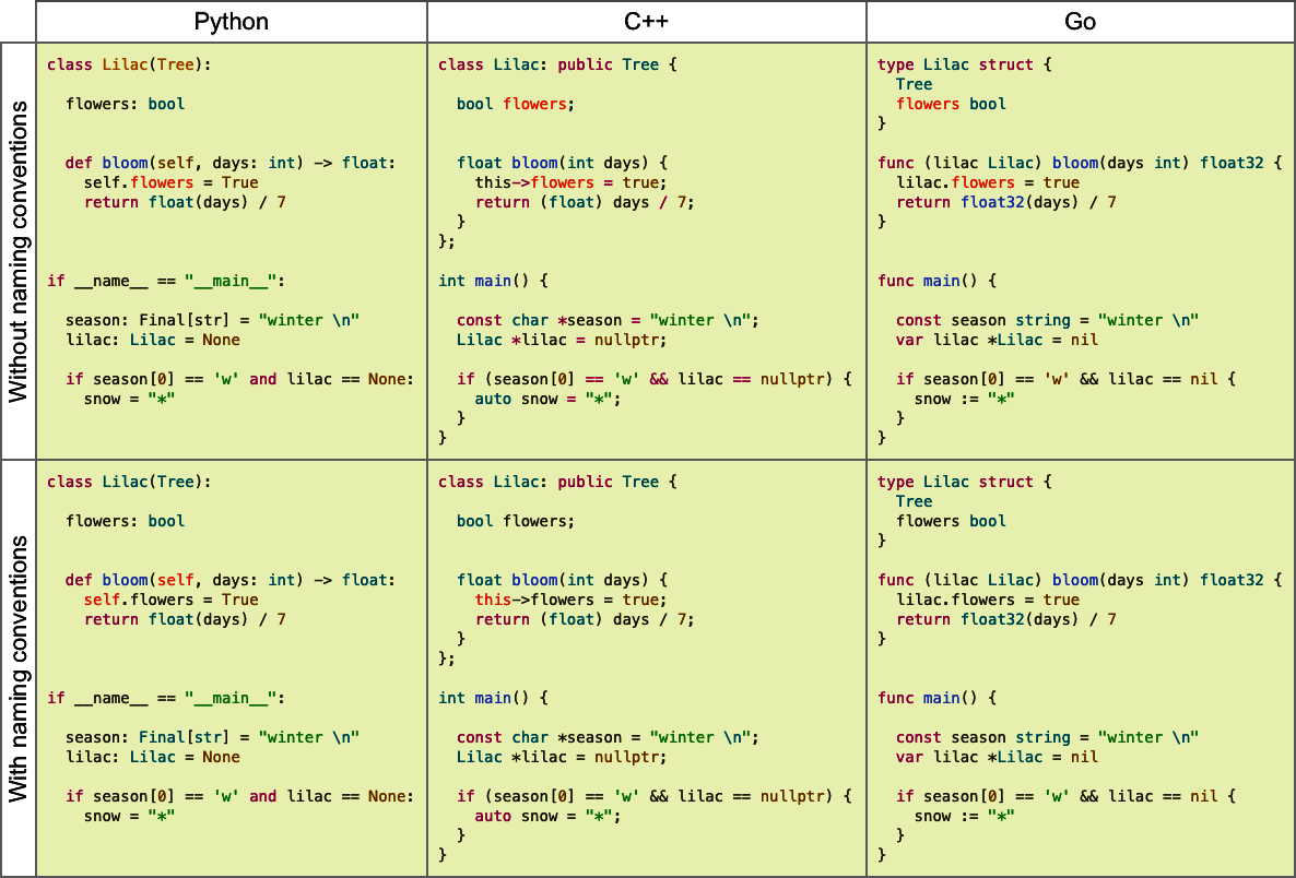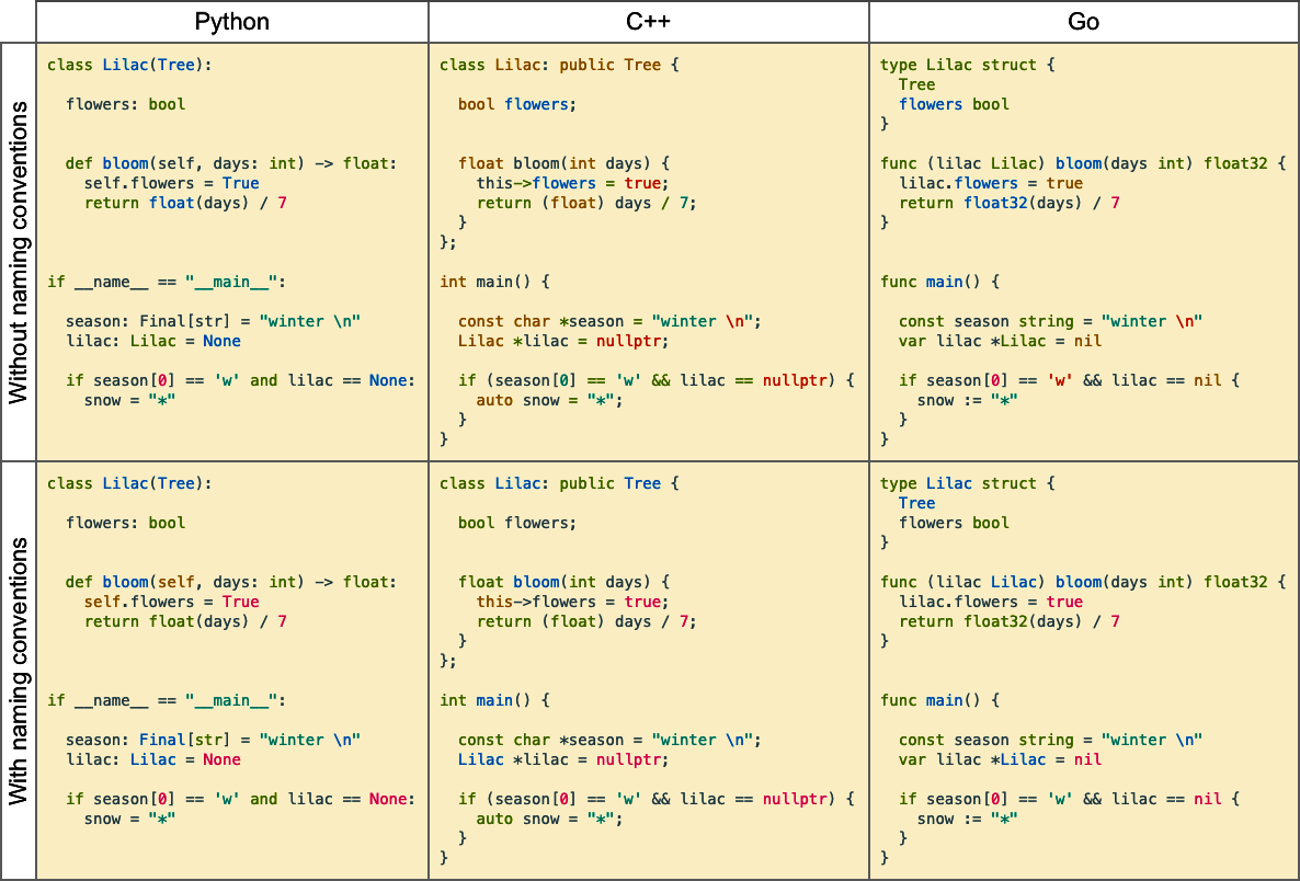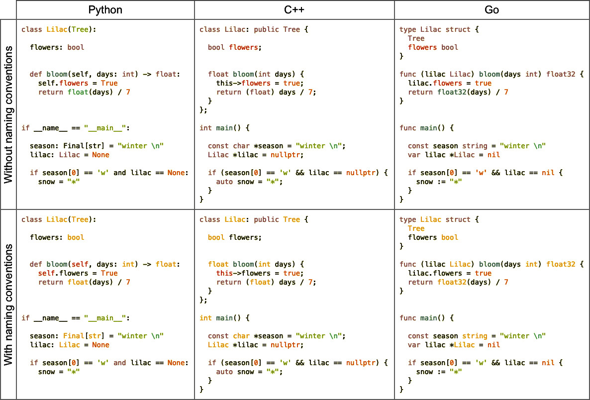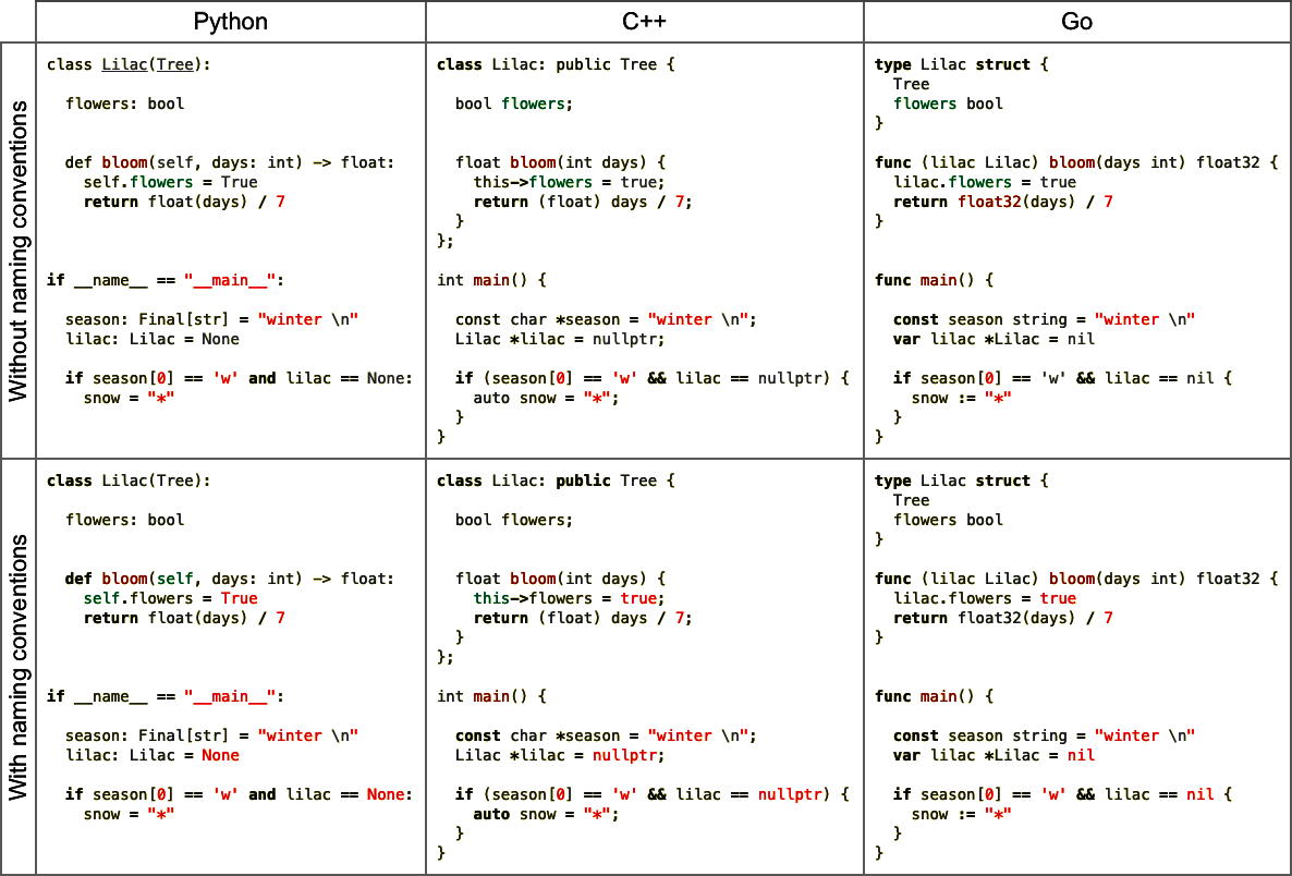 Here are some previews of the improvements brought by this PR. For each theme, notice the differences before and after implementing the naming conventions. Syntax highlighting is really harmonized across languages. Python: class Lilac(Tree):