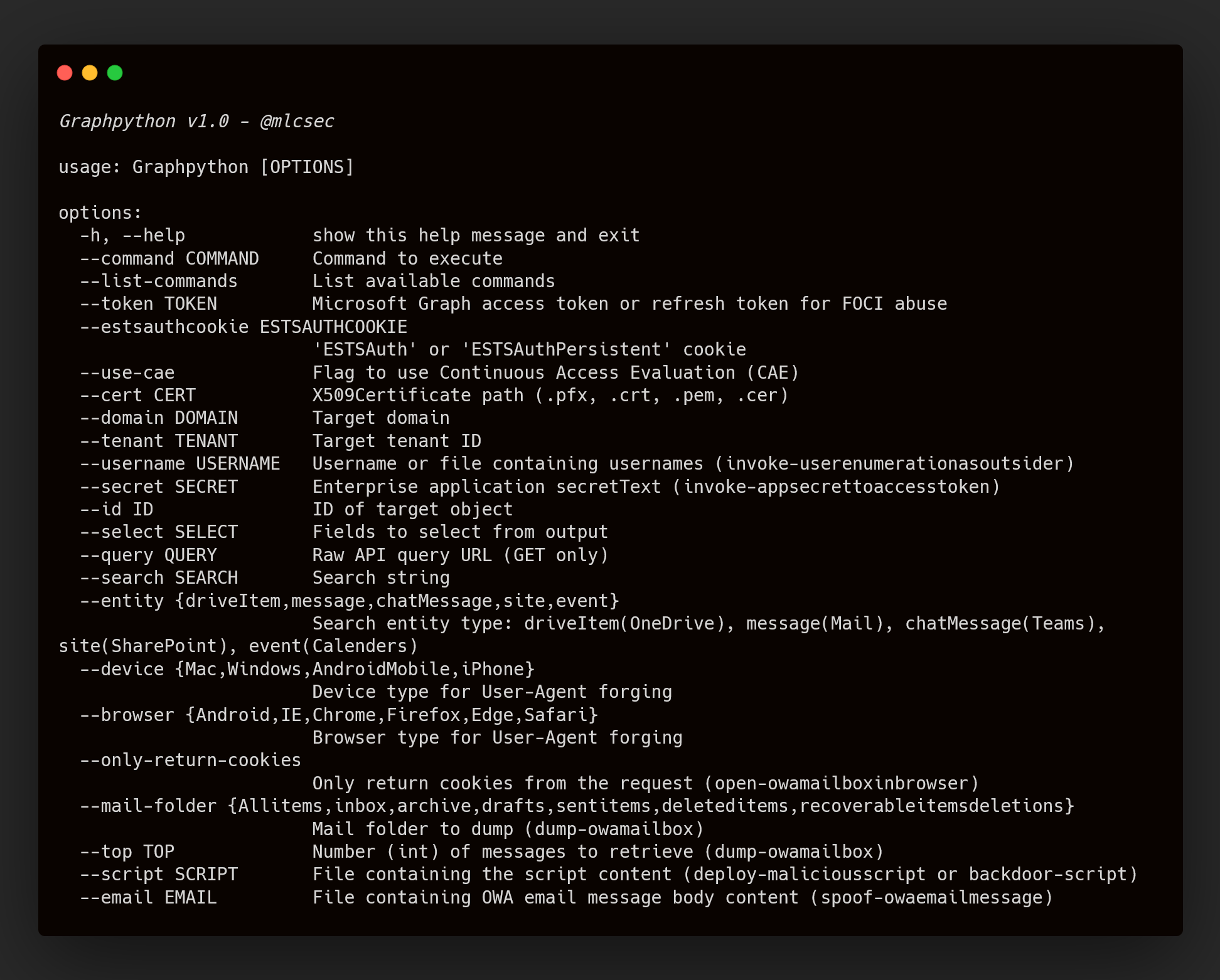 Graphpython covers external reconnaissance, authentication/token manipulation, enumeration, and post-exploitation of various Microsoft services, including Entra ID (Azure AD), Office 365 (Outlook, SharePoint, OneDrive, Teams), and Intune (Endpoint Management).