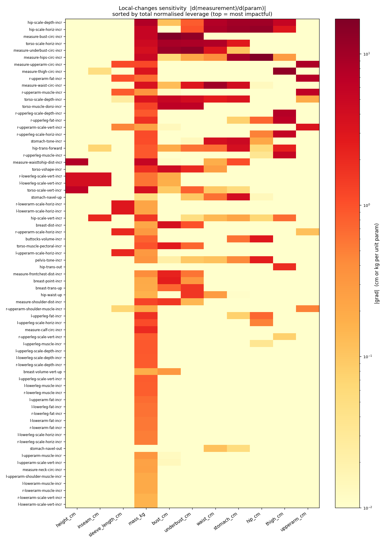 Jacobian heatmap for every Anny local_changes dimension against every supported measurement — |d(measurement)/d(param)| averaged across 6 reference bodies. Darker cells mean the local_change has strong leverage over that measurement; pale cells mean the gradient is near zero and Adam will barely move it. Useful when deciding which params to unfreeze for a given fit target (e.g. optimising bust_cm is pointless without measure-bust-circ-incr or torso-scale-horiz-incr in the active set). Regenerate with python tools/sensitivity_map.py --output <path>.