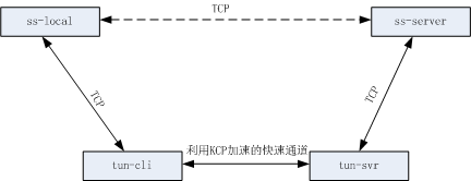 首先 tun-cli 绑定固定的IP和端口,ss-local 之前指向 ss-server 的服务端地址改而指向 tun-cli 所绑定的地址。 此后,ss-local 的通信对象实际是 tun-cli ,但 tun-cli 是不能直接为 ss-local 提供服务的。 tun-cli 与 tun-svr 建立通信管道,tun-cli 将从 ss-local 收集的数据直接发往 tun-svr。 tun-svr 将"冒充" ss-local 与 ss-server 进行分组交换,而 tun-svr 从 ss-server 获取的数据将直接发送给 tun-cli。 tun-cli 将从 tun-svr 收到的数据转发给 ss-local。这样,ss-local 与 ss-server 就完成了一次通信。